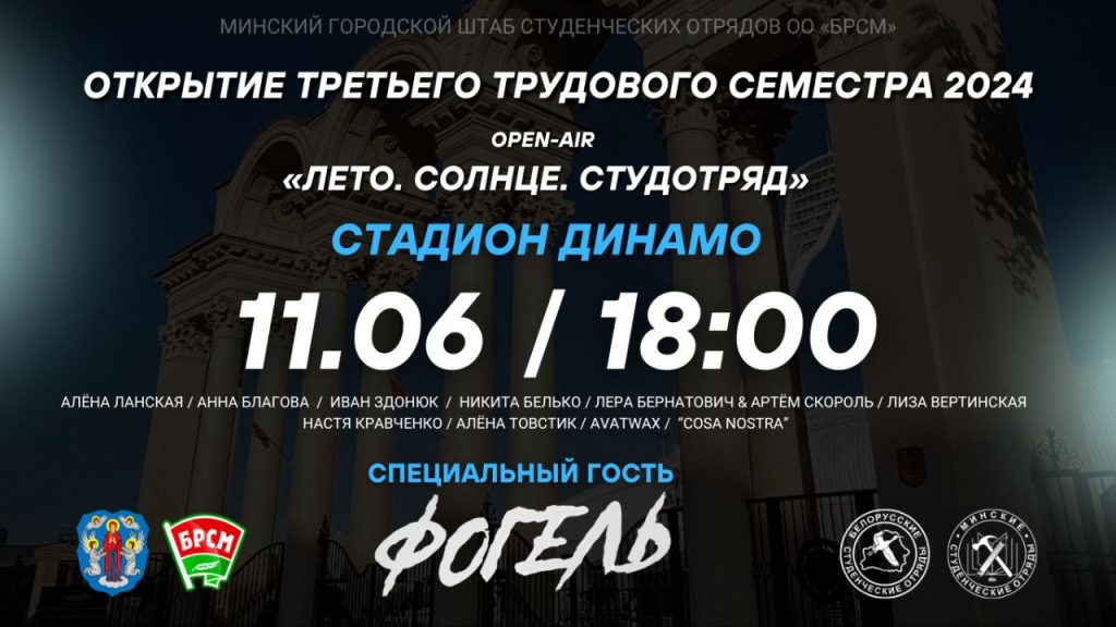 11 июня на стадионе «Динамо» вместе открываем Третий трудовой семестр 2024 города Минска! В программе много интересного: молодёжное студотрядовское шествие, вручение трудовых путевок студотрядам столицы, работа интерактивных площадок, фудтраков и многое другое.