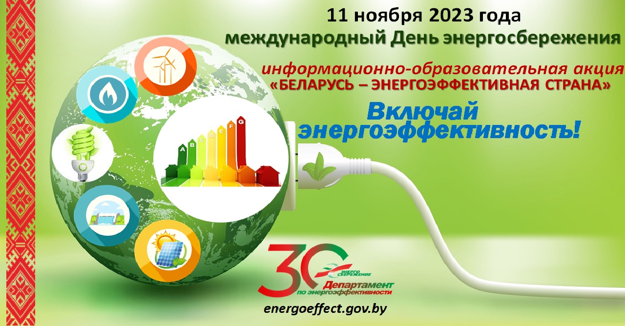С 8 по 11 ноября 2023 года Департамент по энергоэффективности проводит республиканскую информационно-образовательную акцию «Беларусь – энергоэффективная страна» под девизом «Включай энергоэффективность!», приуроченную к международному Дню энергосбережения, который ежегодно отмечается 11 ноября.
