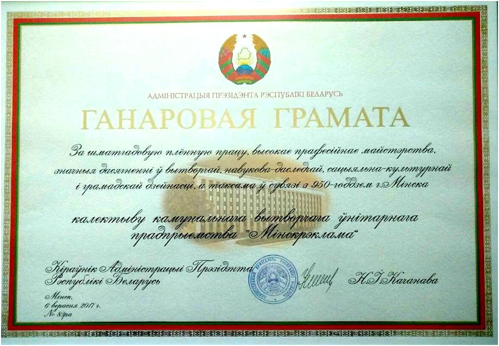 Государственное предприятие «Минскреклама» награждено Почетной грамотой Администрации Президента Республики Беларусь